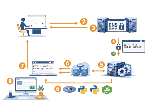 - Браузърът визуализира полученото съдържание.